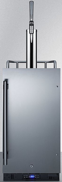 Summit offers a complete line of built-in kegerators/nitro coffee dispensers designed for use in commercial establishments. The SBC15NCF features a versatile design that meets NSF-7 and UL-471 commercial standards but is also approved for residential applications. Sized at 15" wide, it features a front-breathing design for built-in installation under counters and a fully finished cabinet for freestanding use. A stainless steel door and black cabinet finish afford added elegance to any setting, while the stainless steel handle completes the look. The sealed back allows for easy cleaning of the unit. Additional features include a removable two-piece stainless steel drip tray to collect spills and a chrome guard rail to help keep glasses and mugs in place. The user-reversible door swing makes it easy to accommodate any location’s setup and four included casters (two are locking) make movement of the unit easy. A factory-installed lock provides added security.Read More